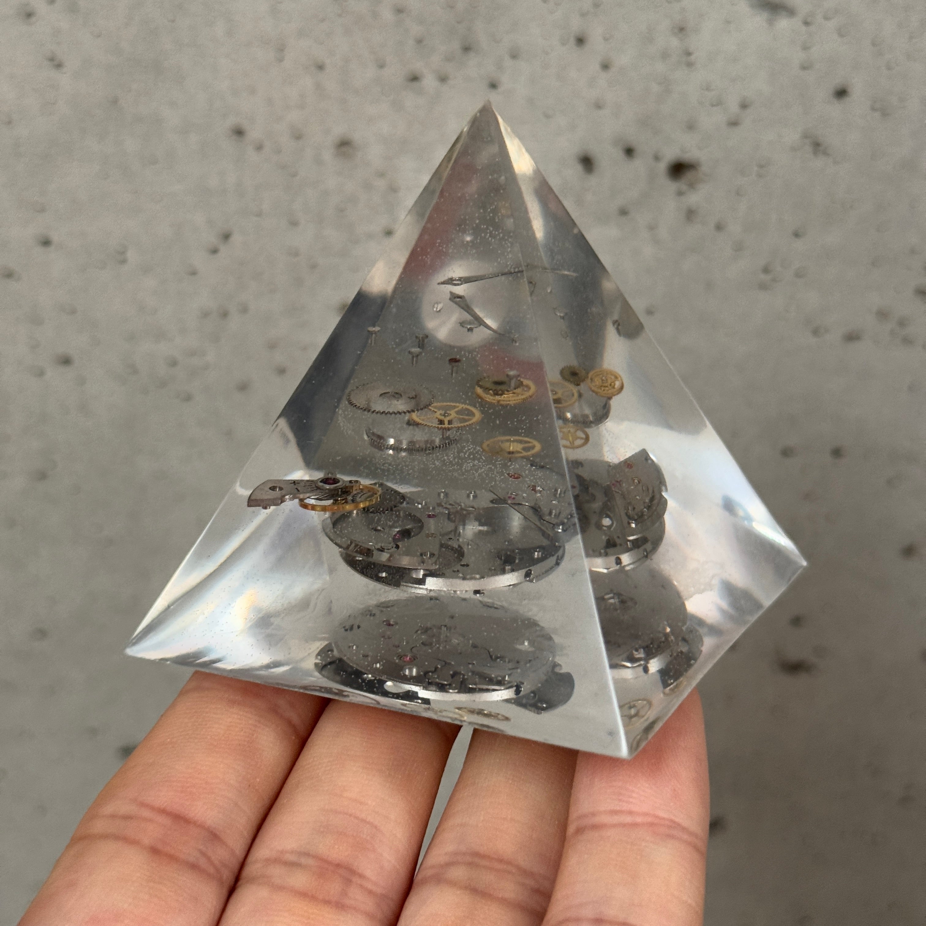 分解された機械式ムーブメントのパーツを一つひとつ封入した、時の結晶オブジェ。
