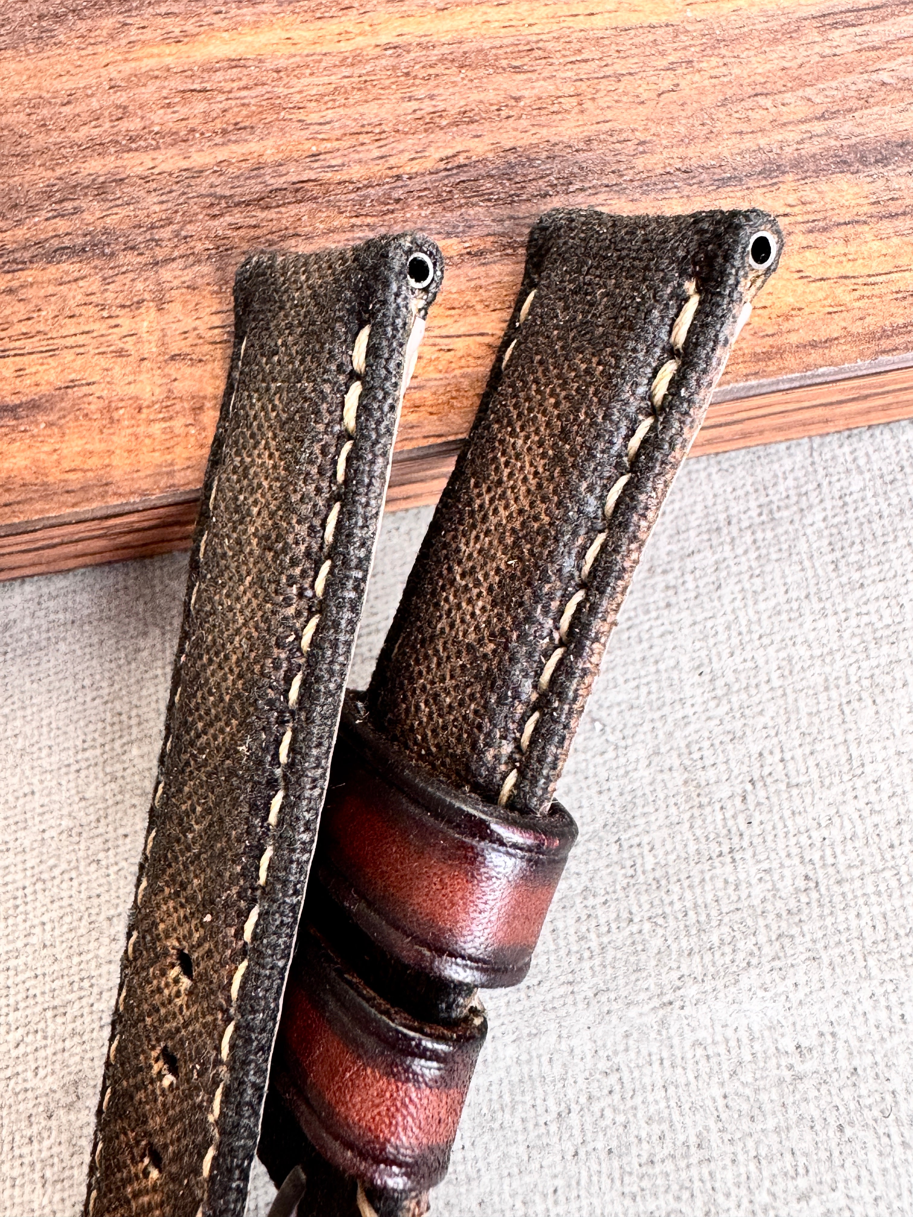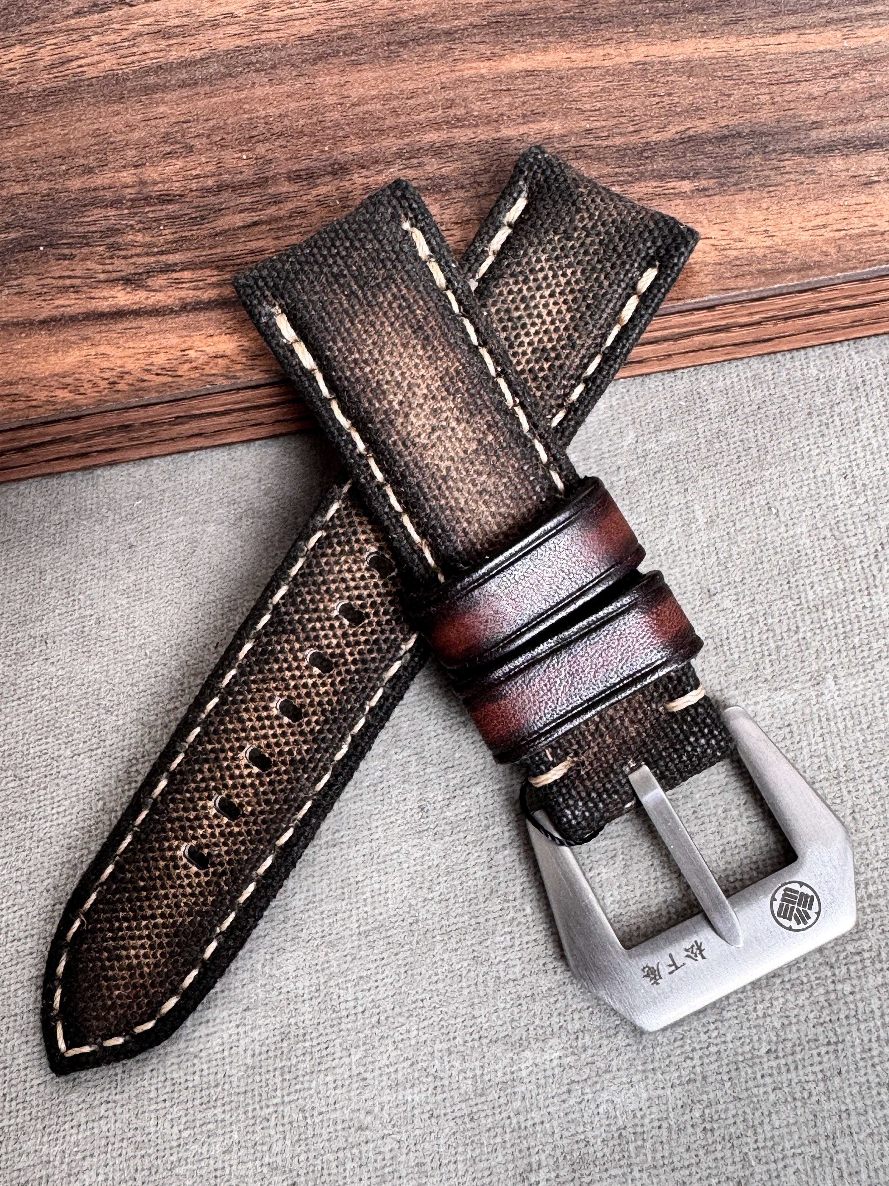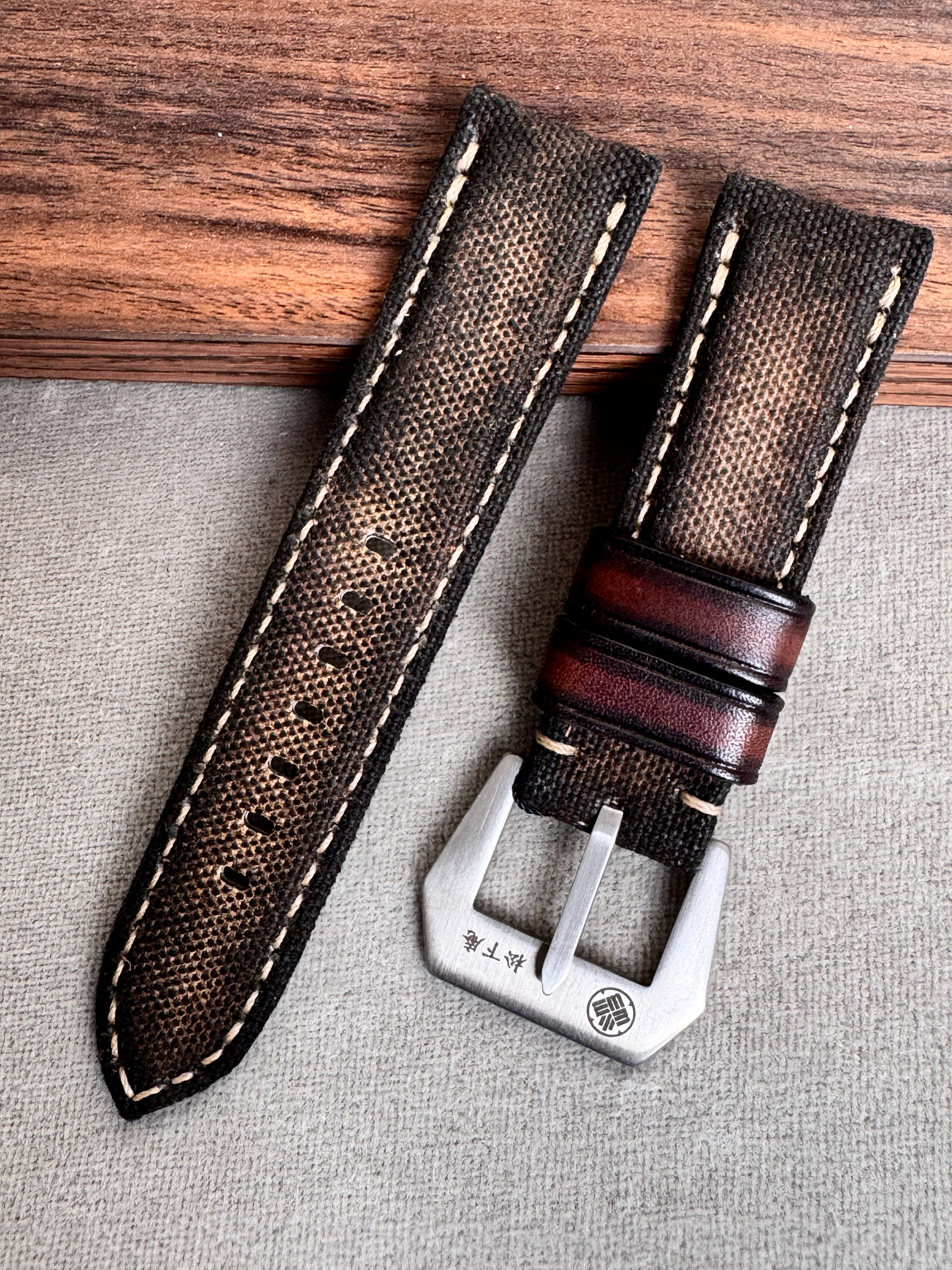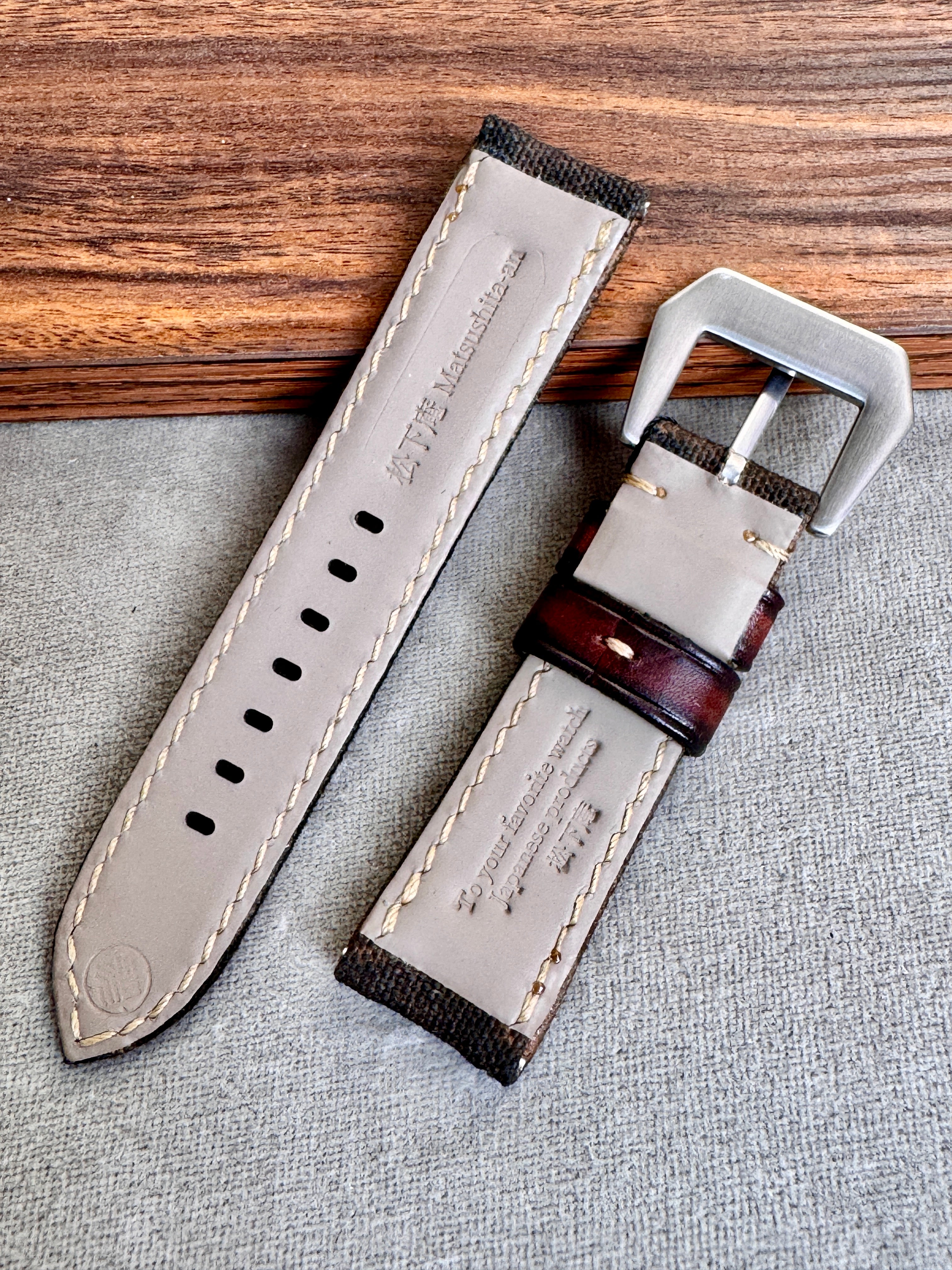 エイジング加工を施した帆布を使用した、キャンバスストラップ。