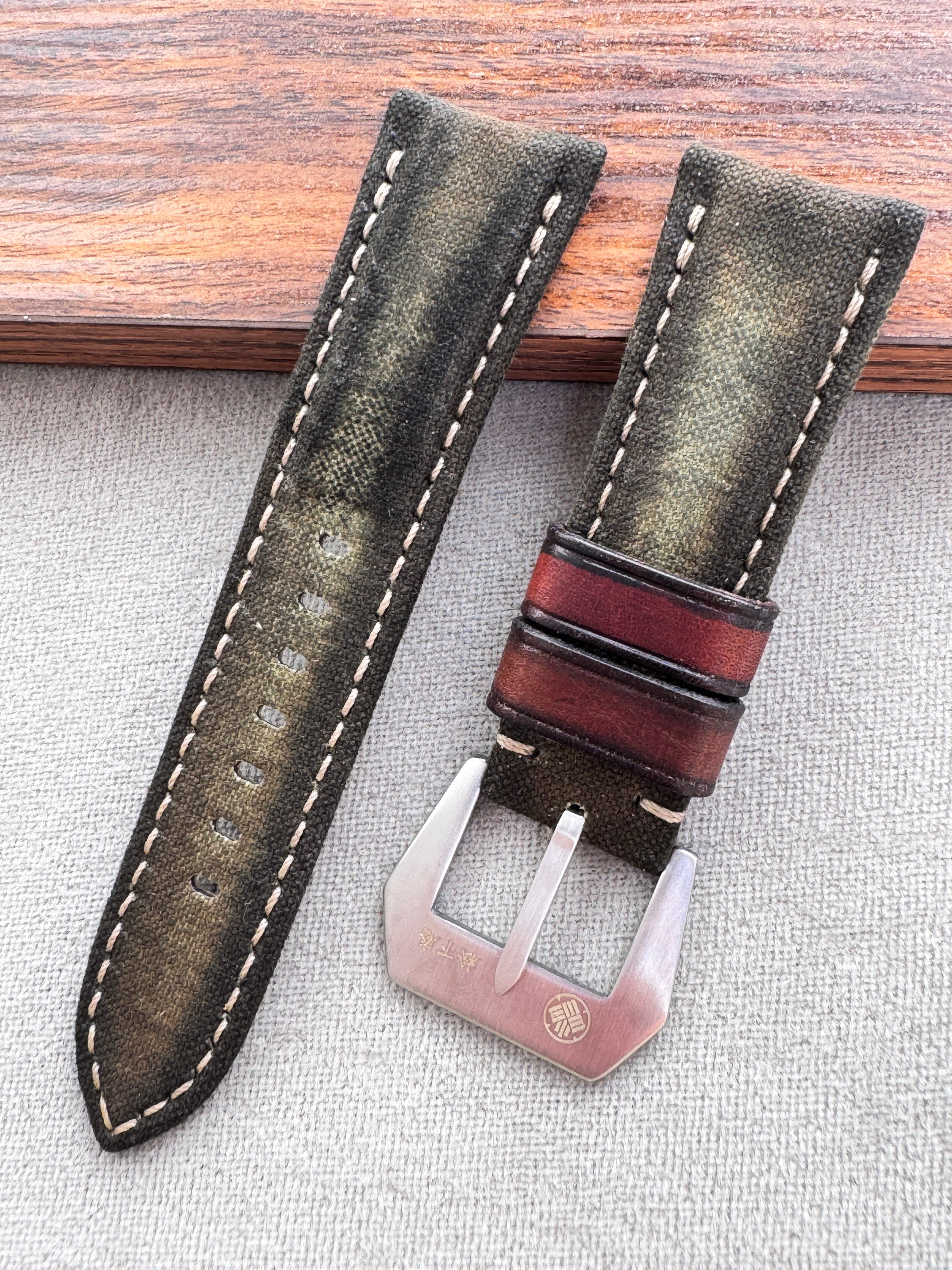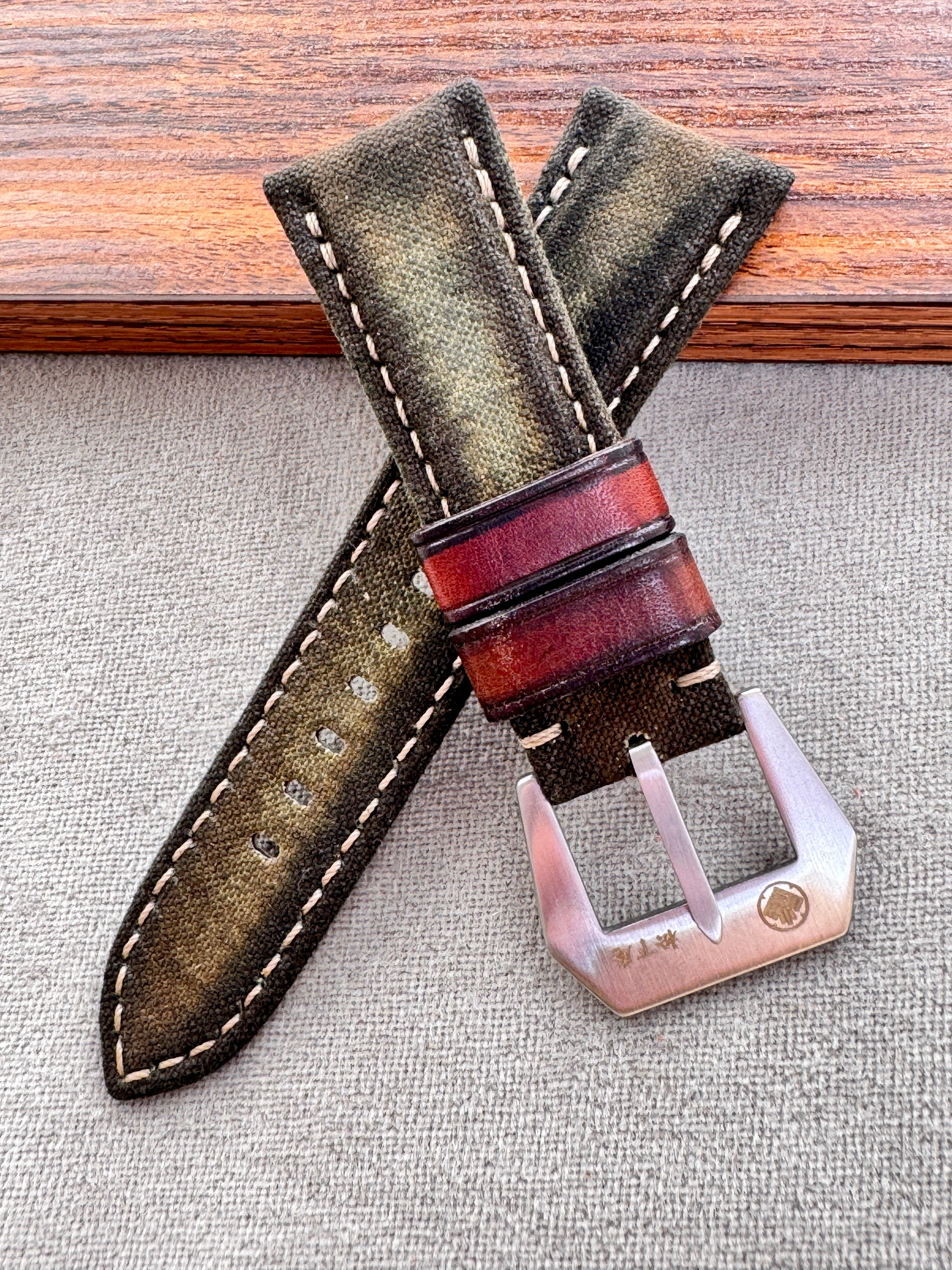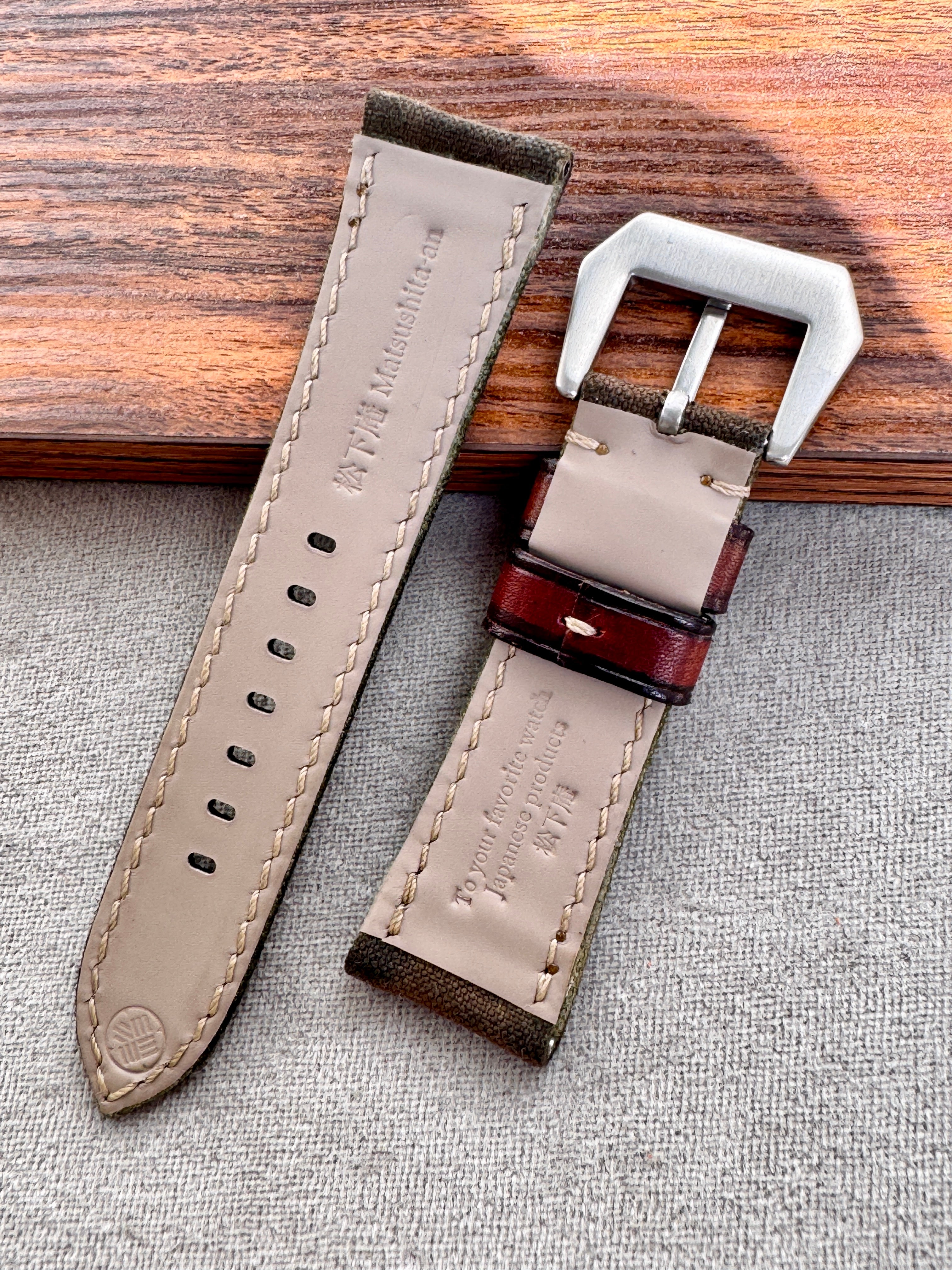 エイジング加工を施した帆布を使用した、キャンバスストラップ。
