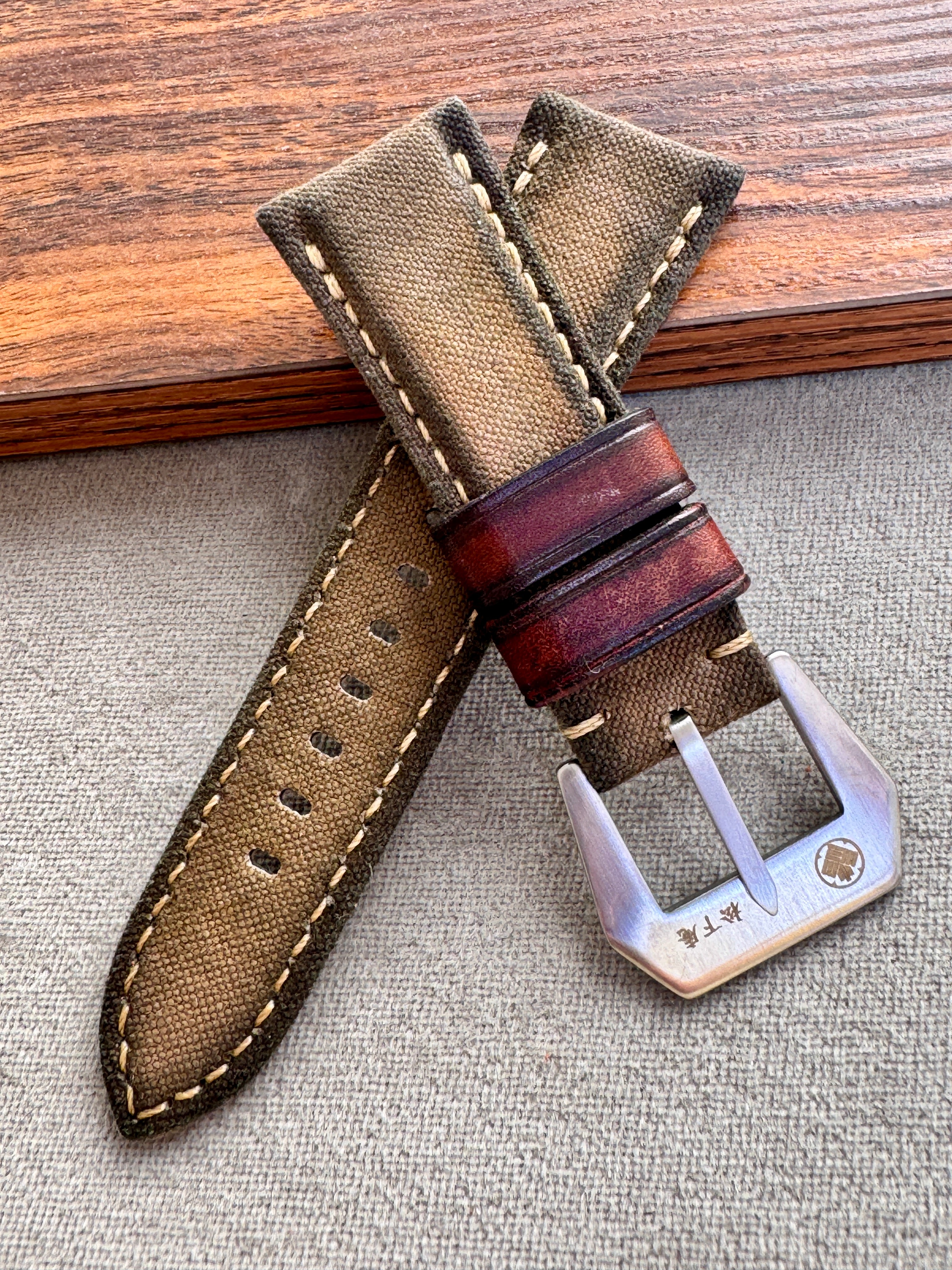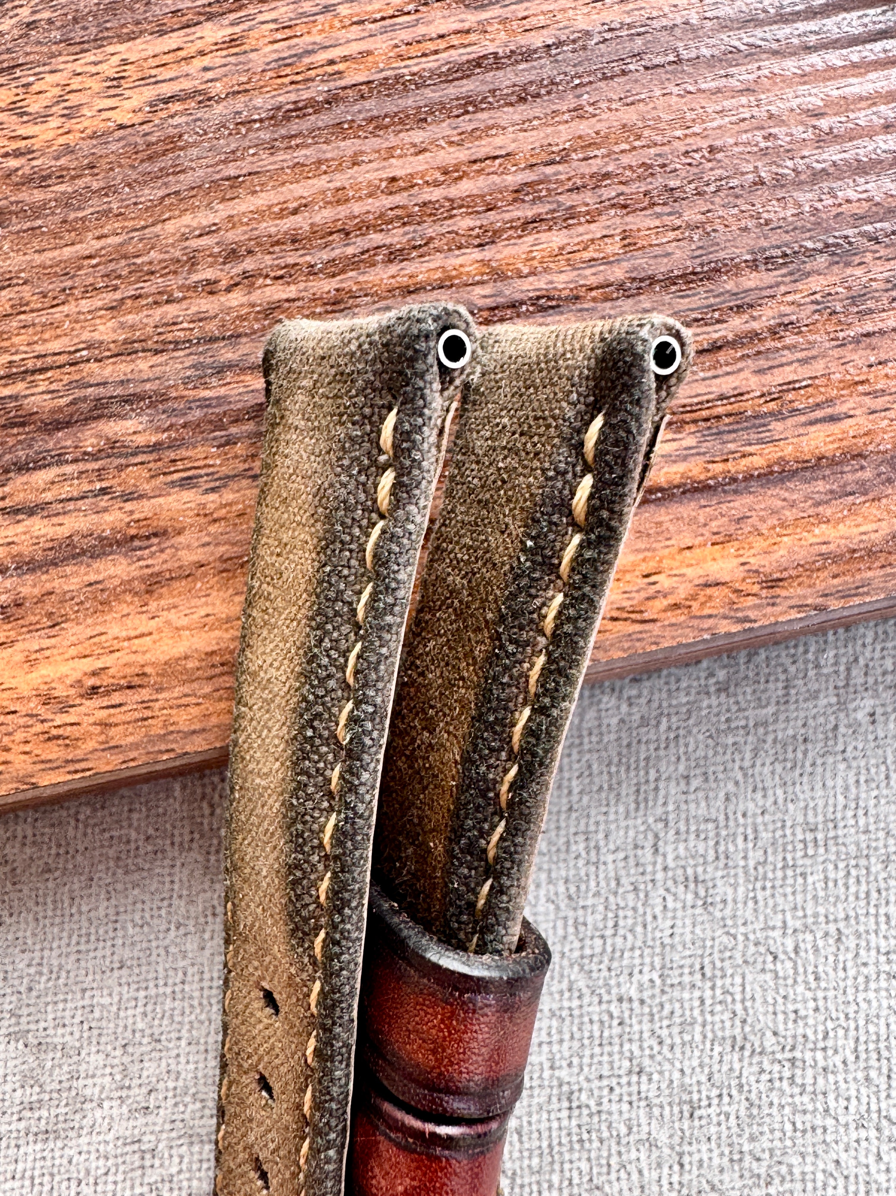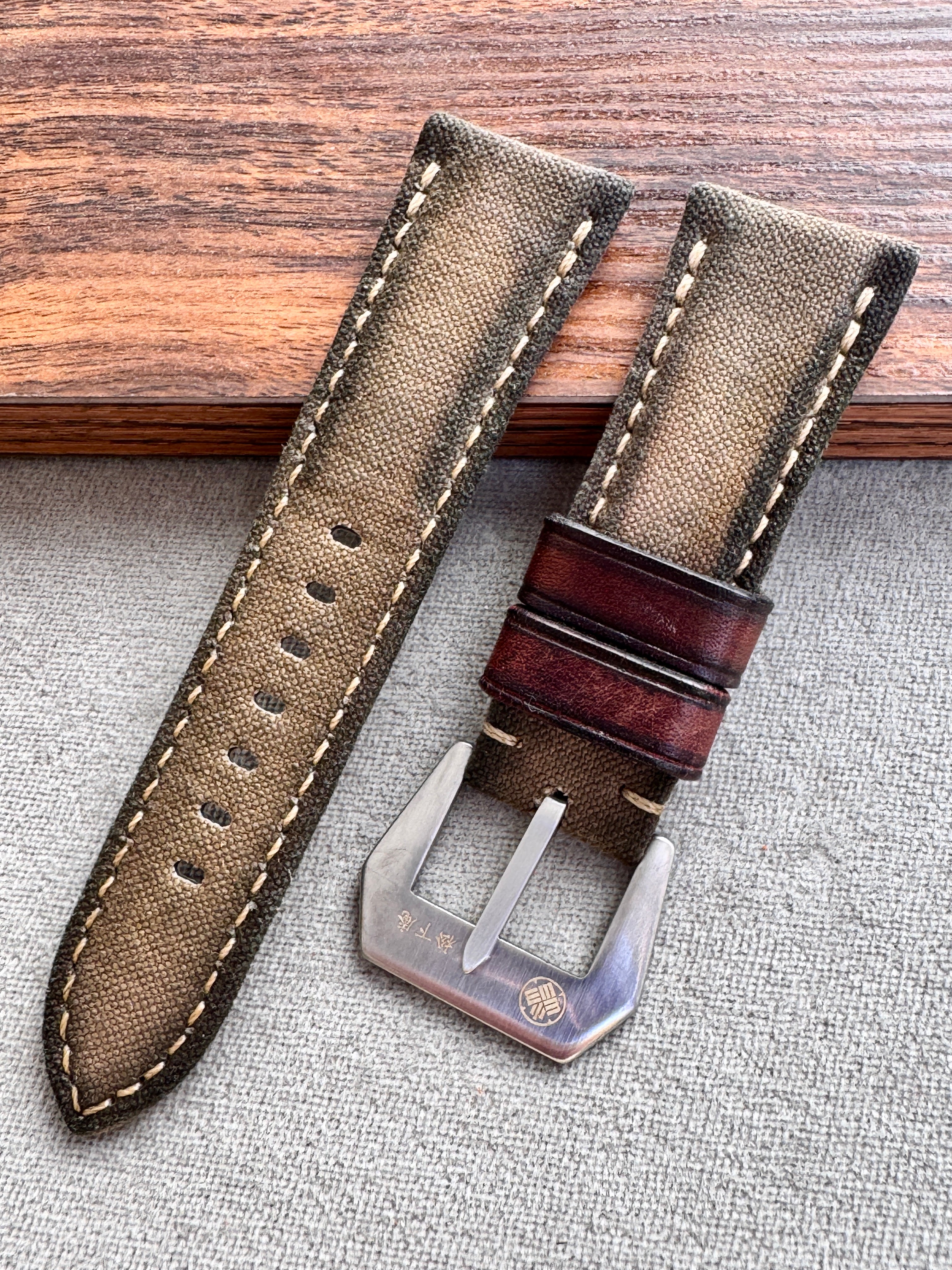 エイジング加工を施した帆布を使用した、キャンバスストラップ。