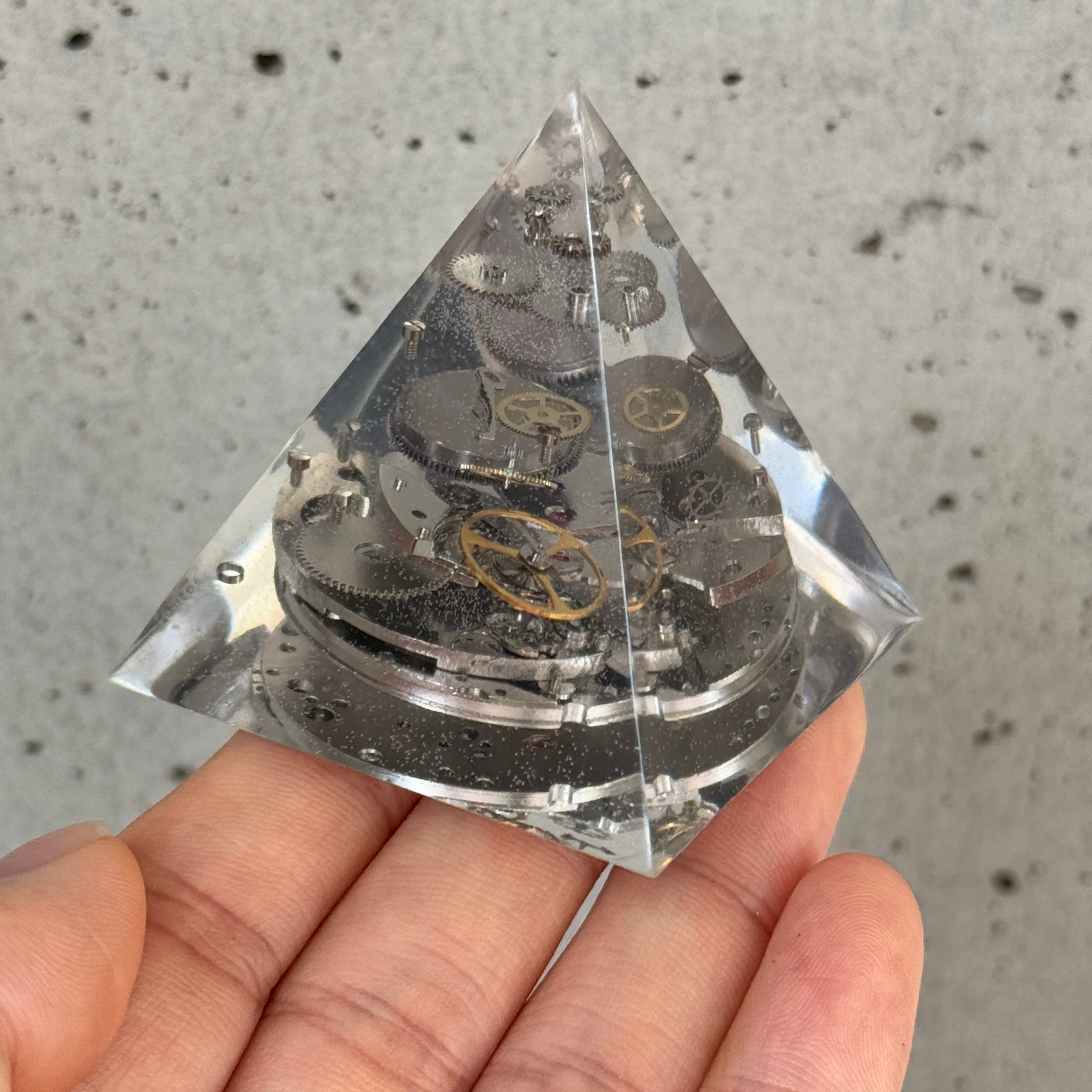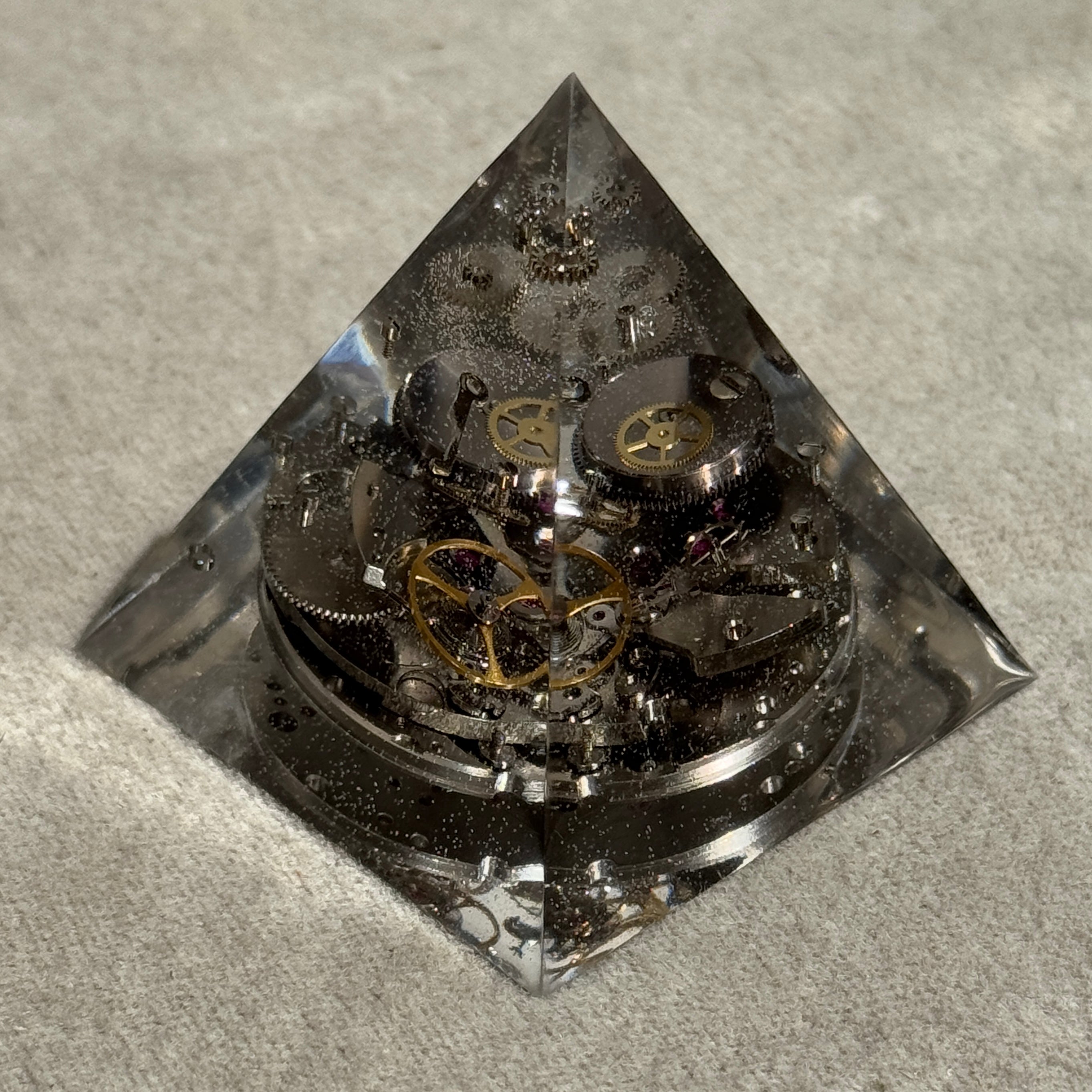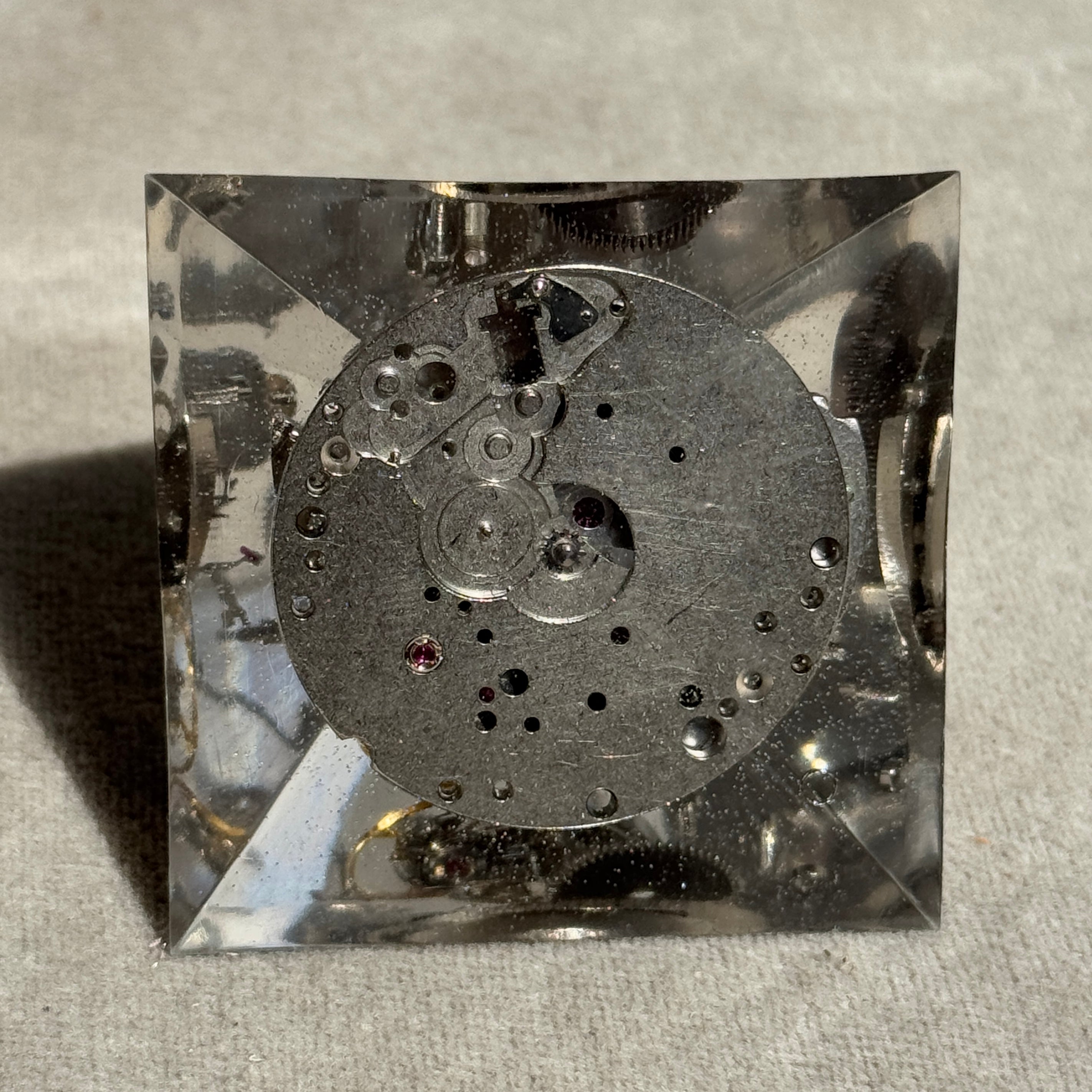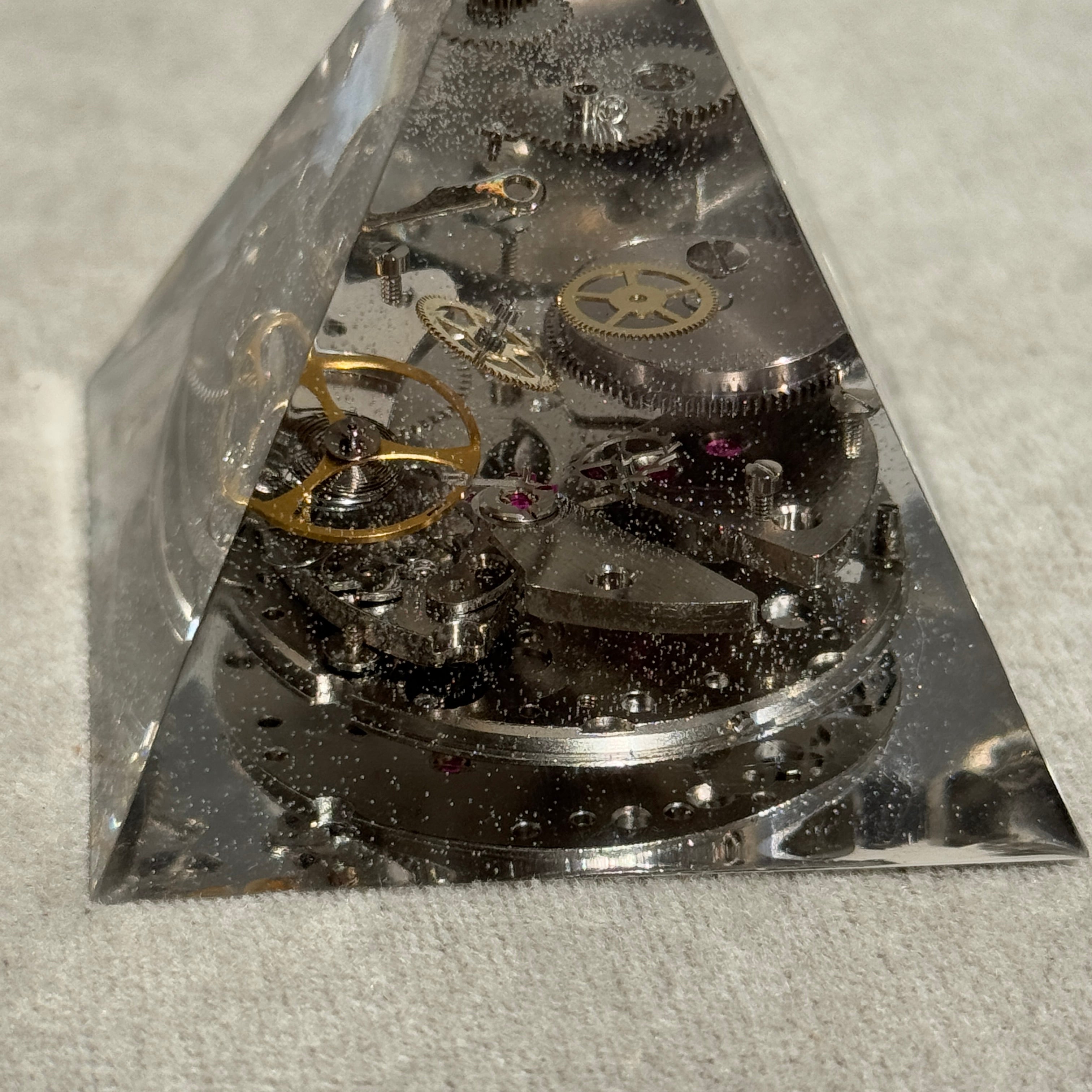 分解された機械式ムーブメントのパーツを一つひとつ封入した、時の結晶オブジェ。