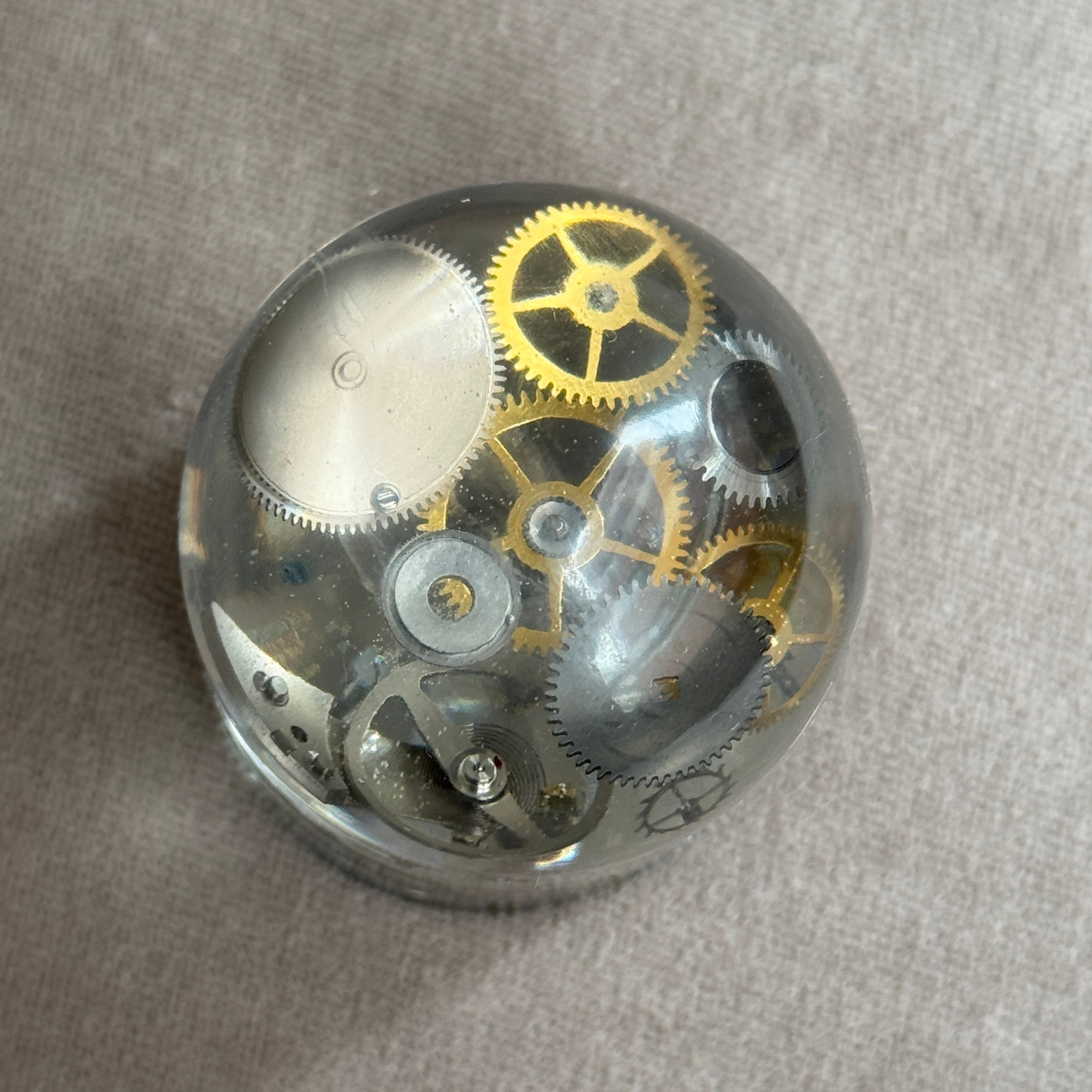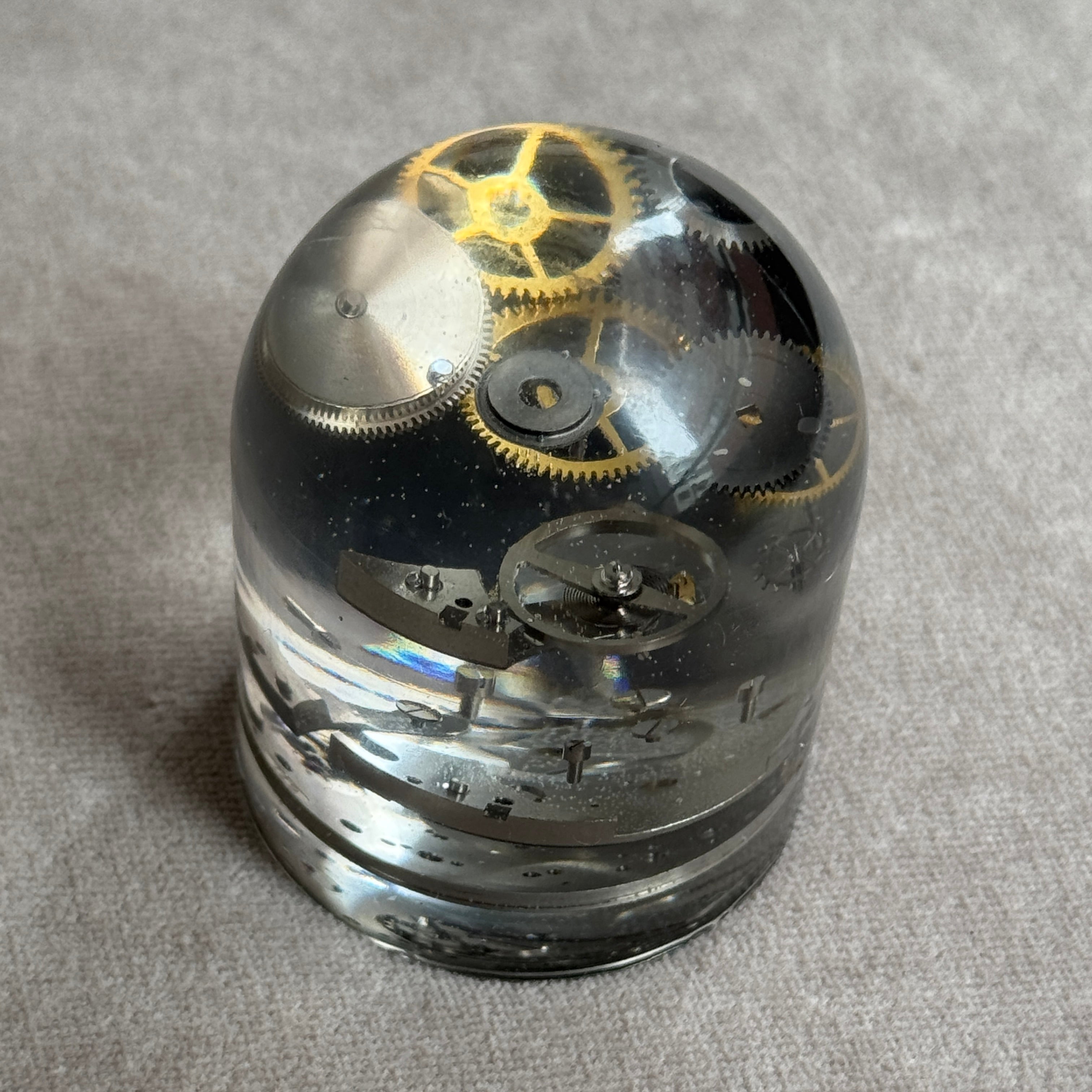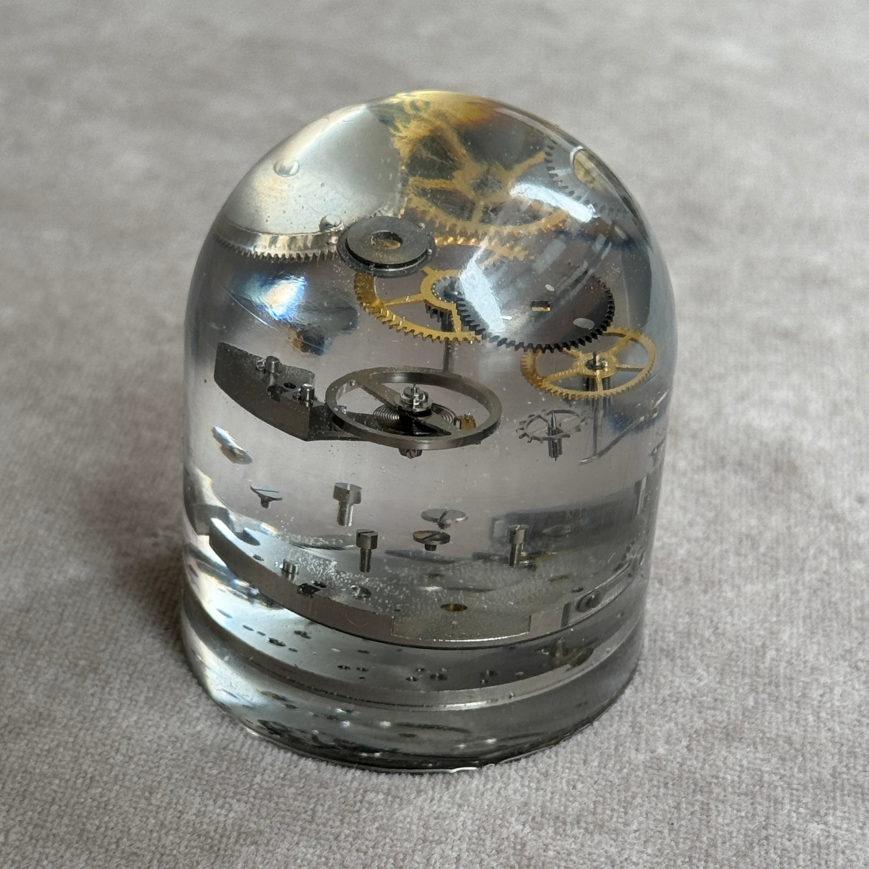 分解された機械式ムーブメントのパーツを一つひとつ封入した、時の結晶オブジェ。