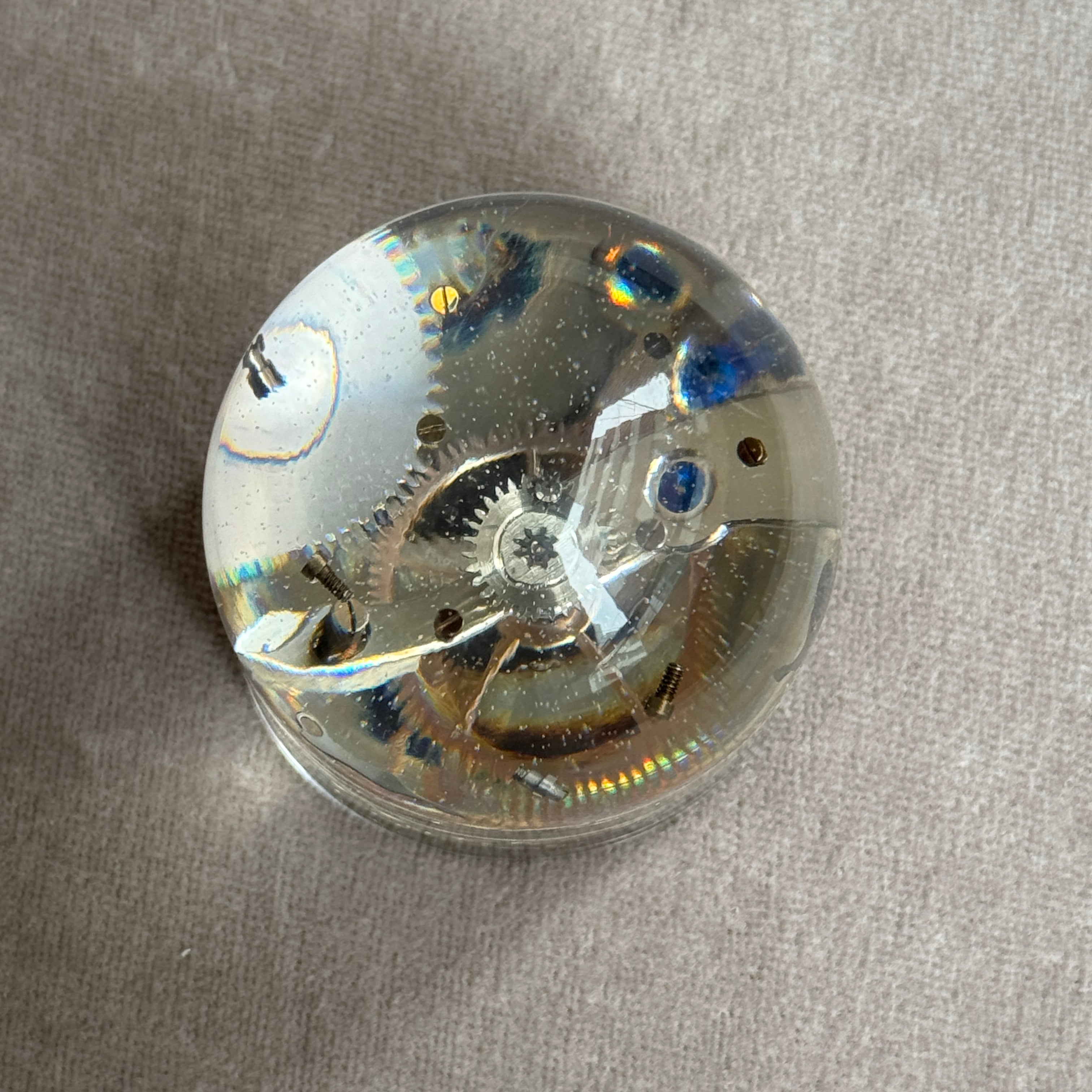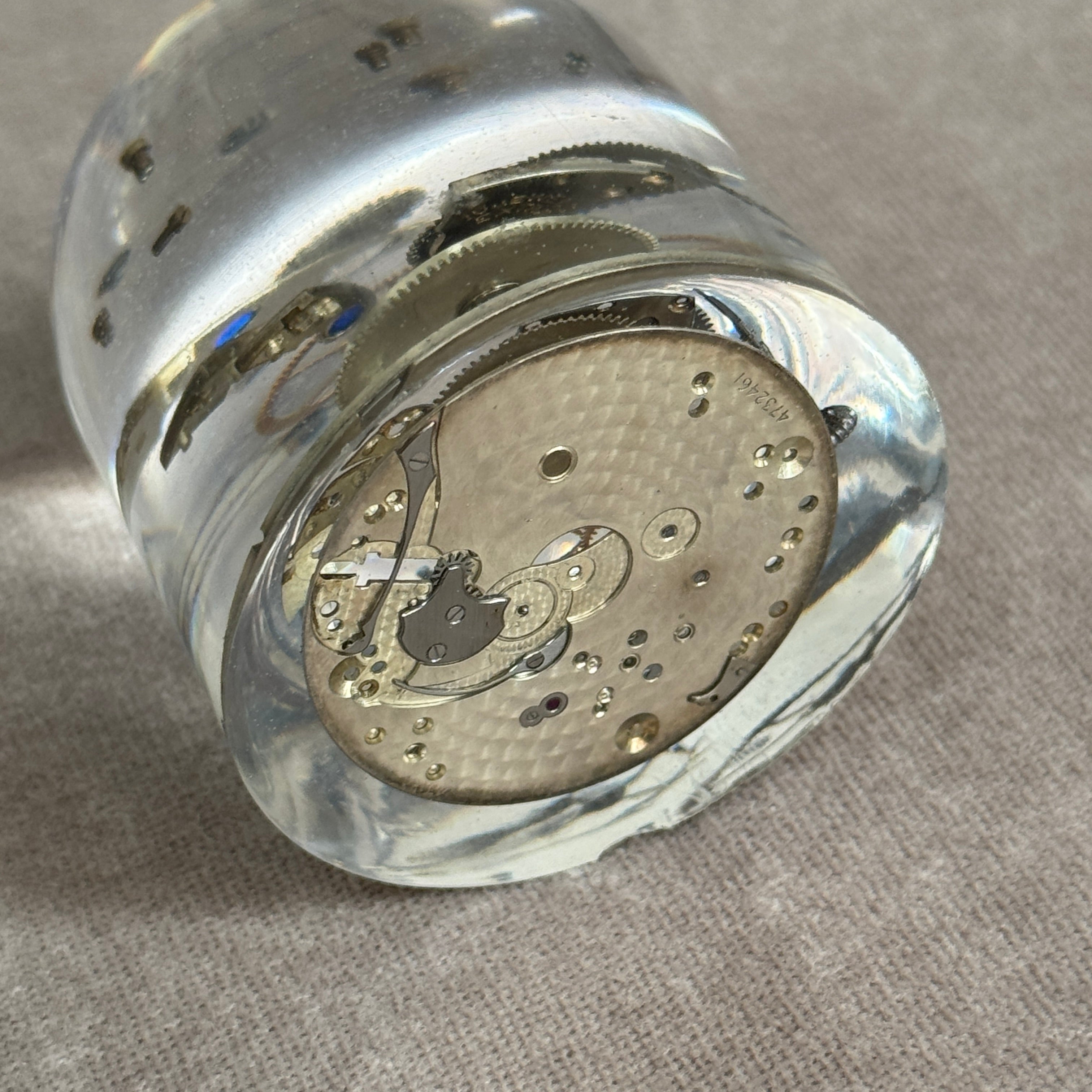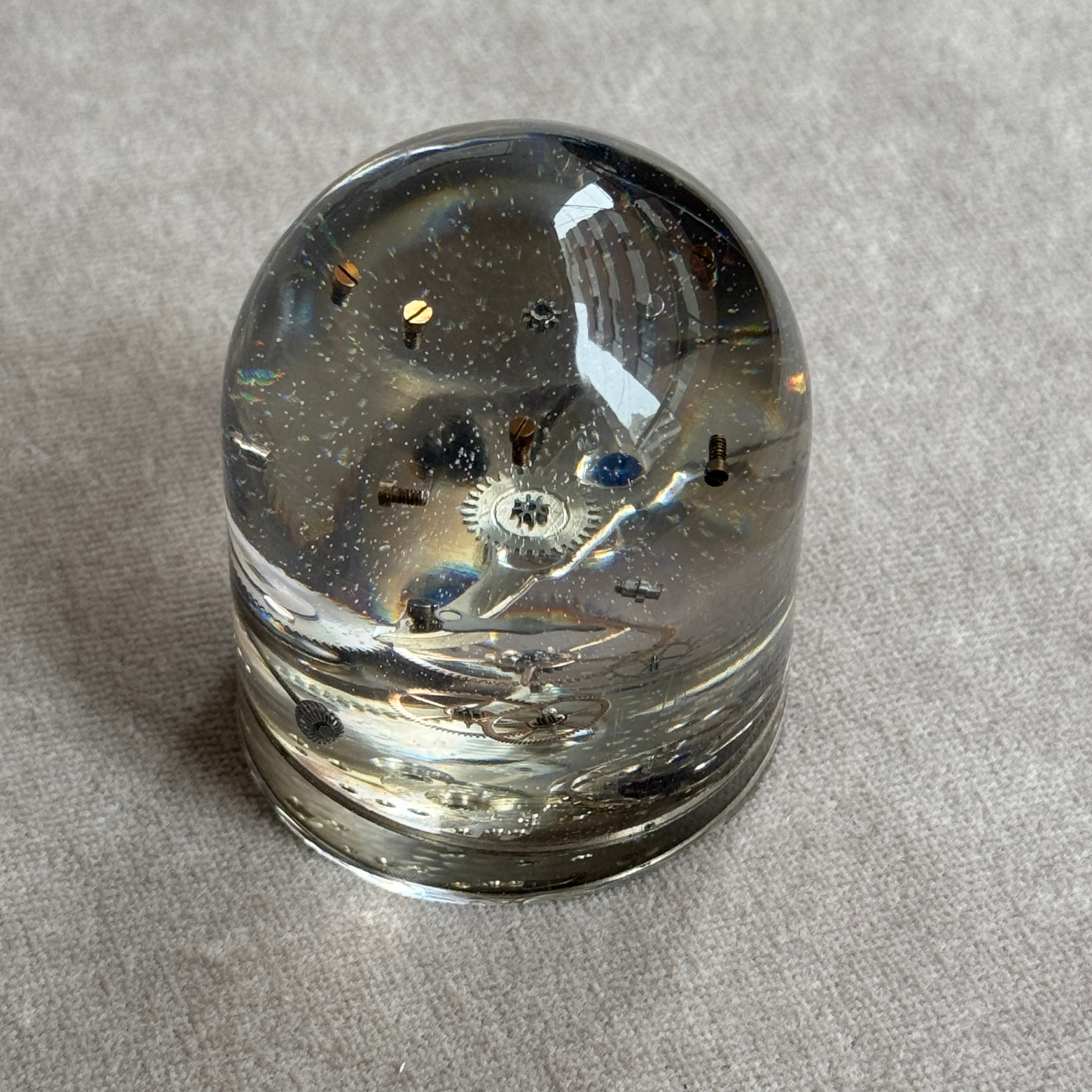 分解された機械式ムーブメントのパーツを一つひとつ封入した、時の結晶オブジェ。