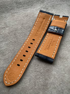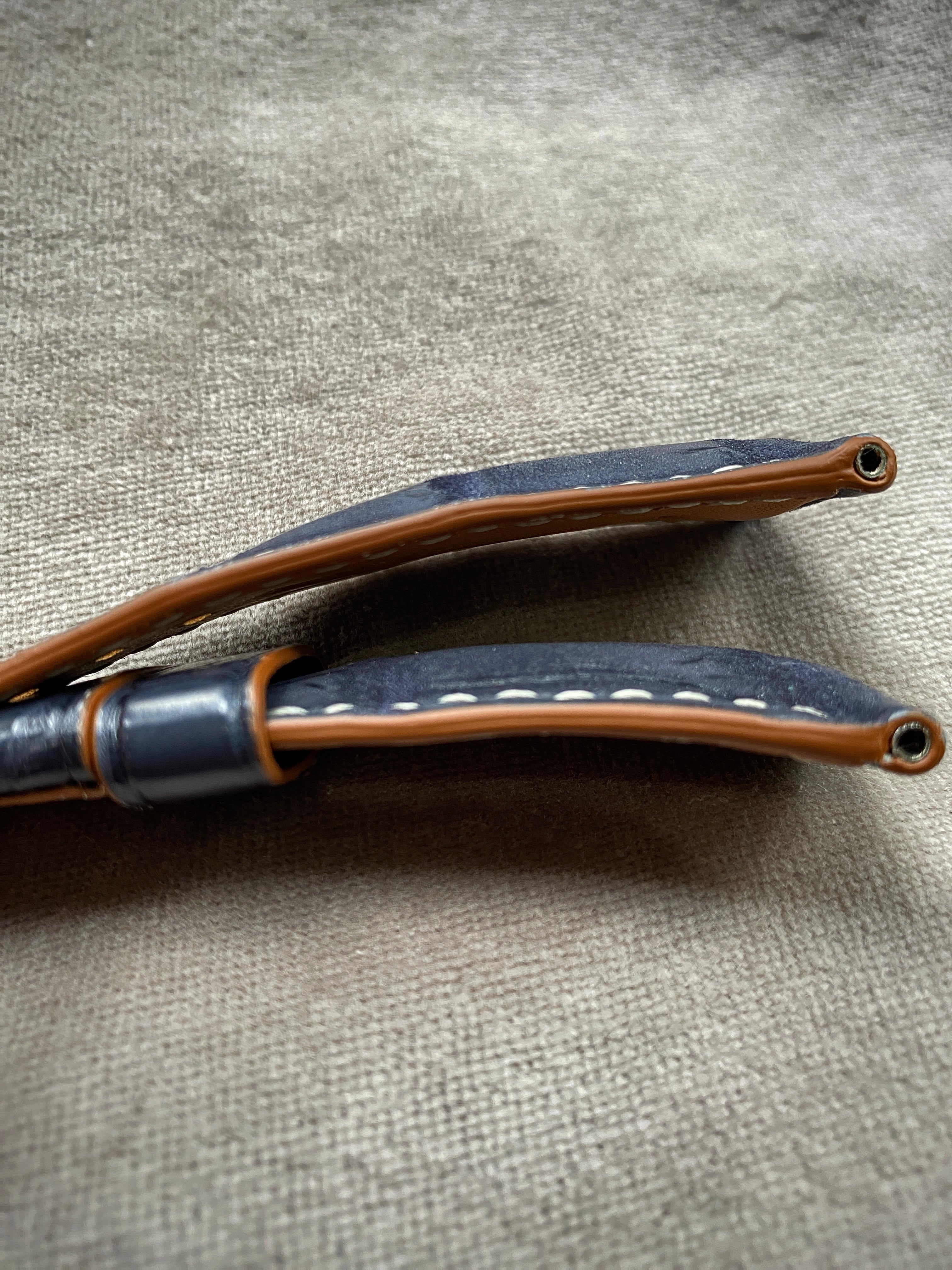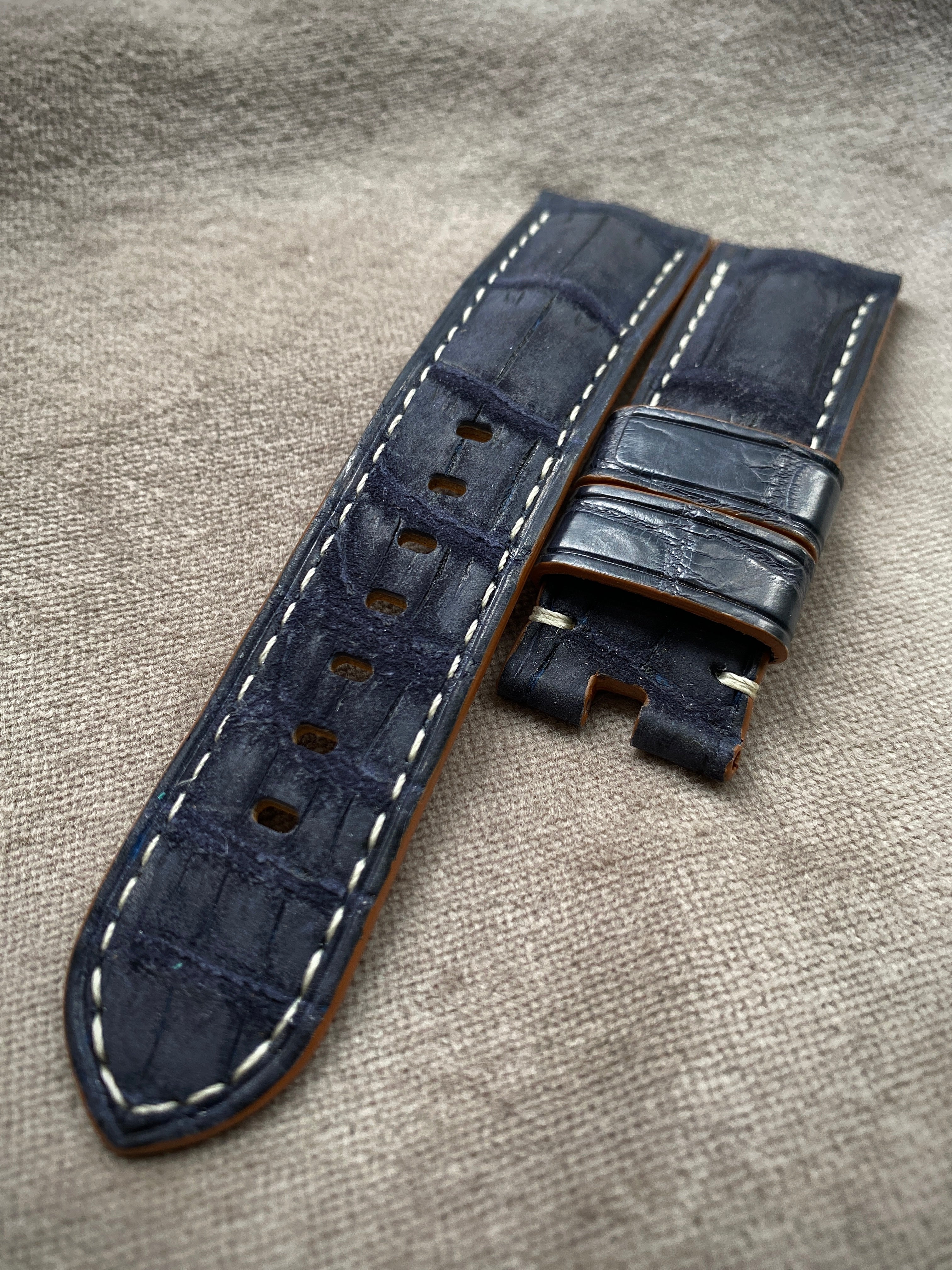 定遊革にはクロコダイルマットネイビーでアクセント。